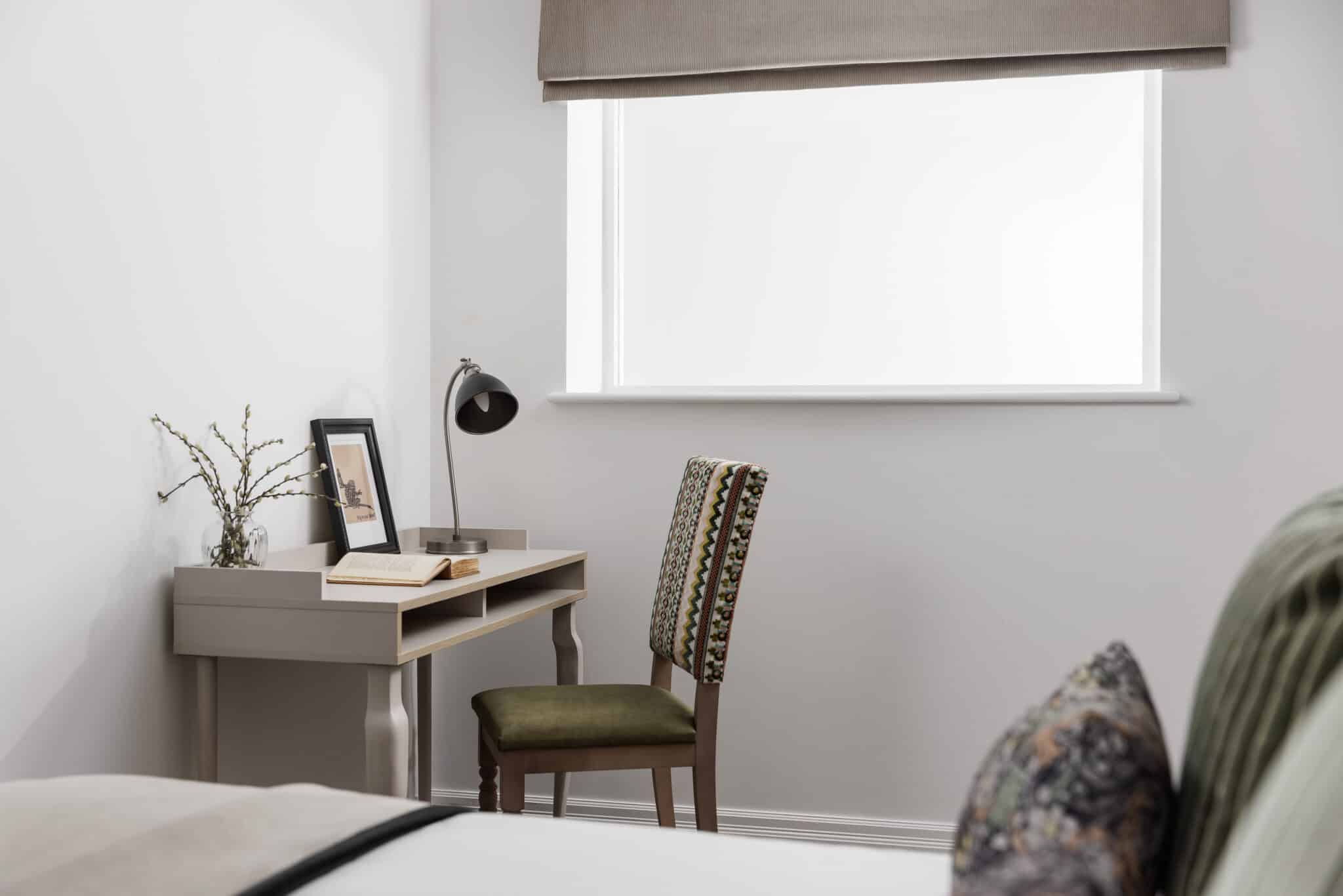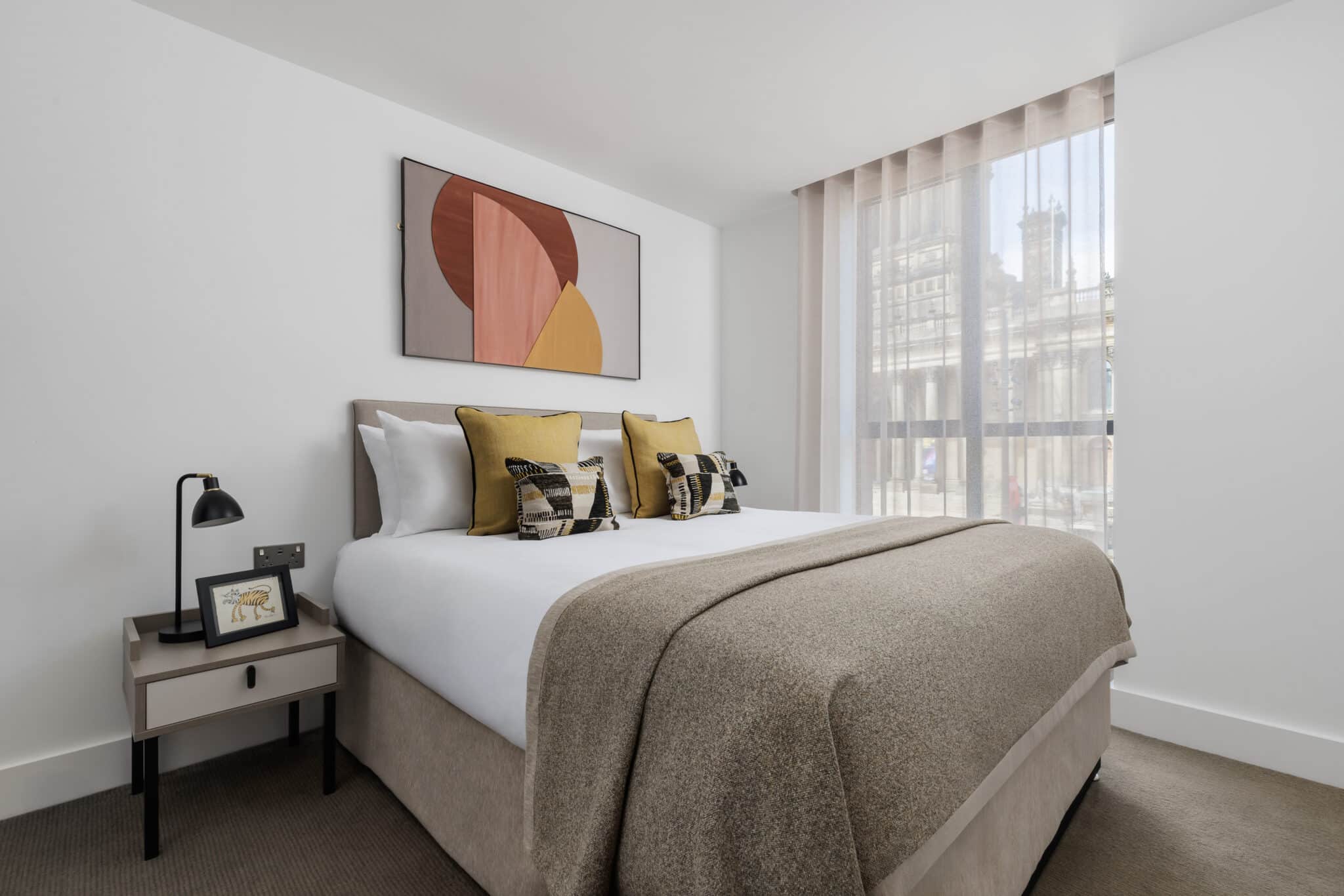 A modern studio apartment featuring a cozy bed, wooden flooring, minimalist décor, wall-mounted art, a sitting area with a table and chairs, and large windows for natural light.