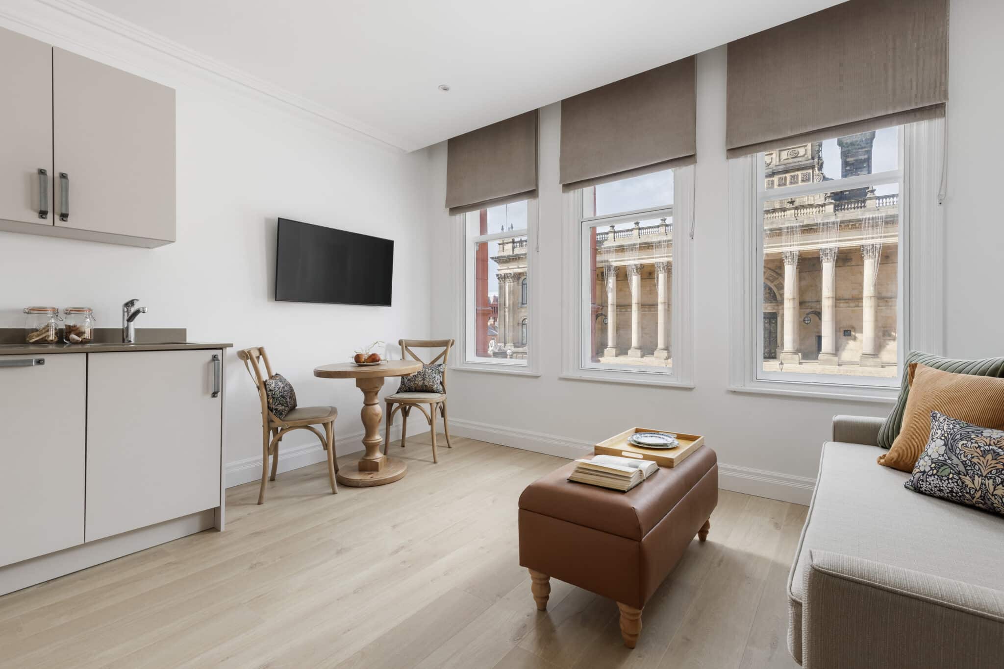 Our One Bedroom Suites offer the luxury of a separate bedroom, making them ideal for travellers desiring more space and comfort. The living area is carefully crafted for relaxation, with a comfortable sofa, fully equipped kitchen, and dining area.