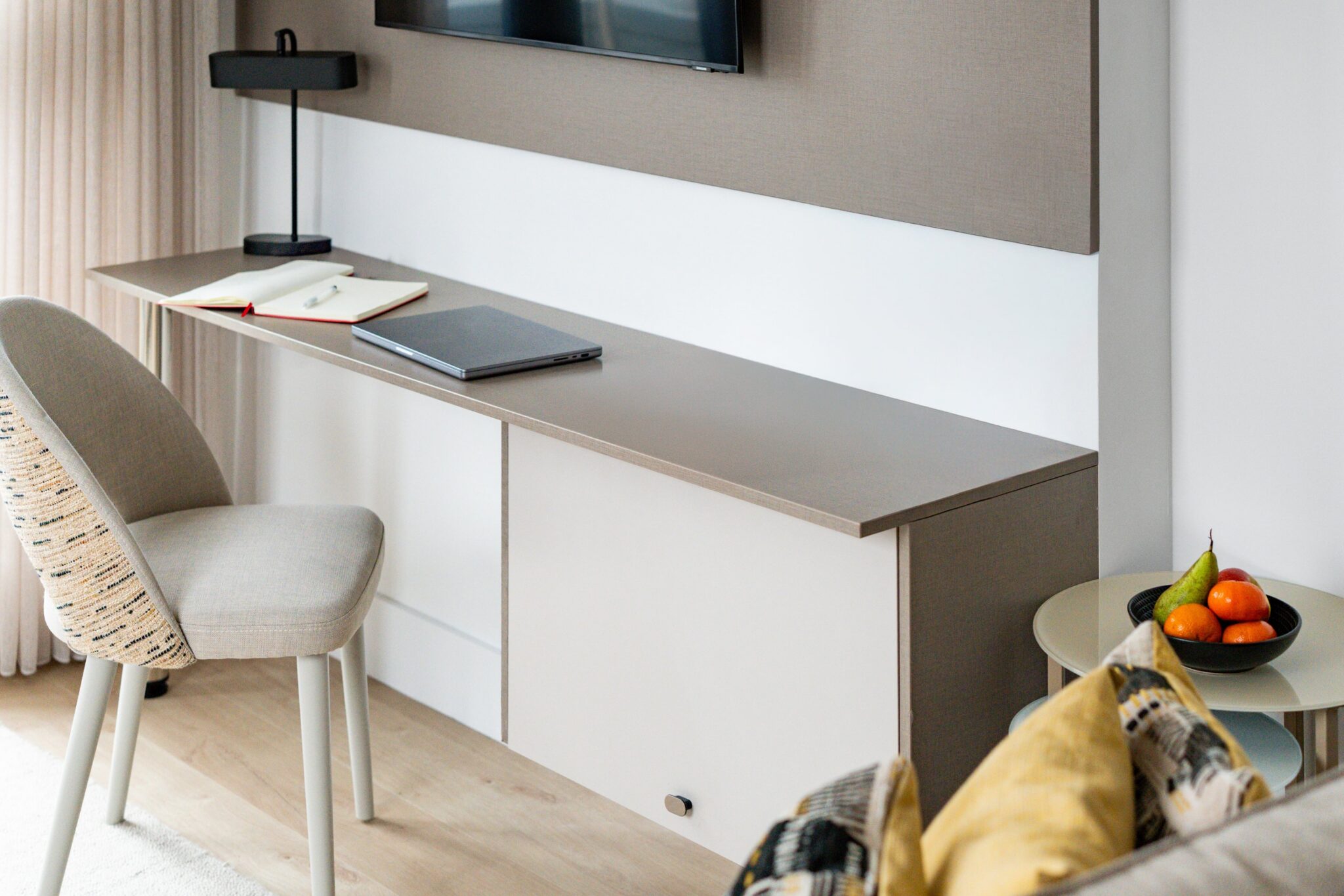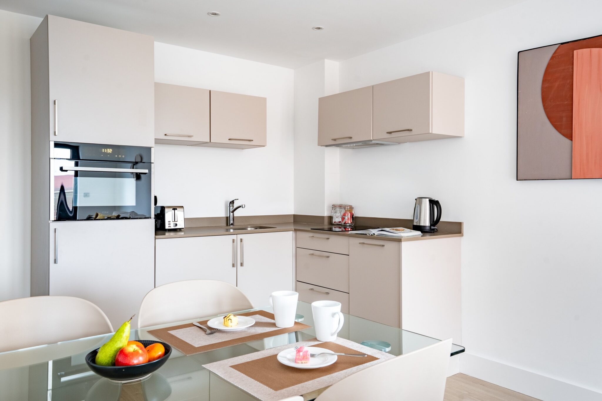 Our Two Bedroom Suites boast two separate bedrooms, ensuring ample space and privacy for all. The living area is thoughtfully designed for relaxation and features a comfortable sofa, a fully equipped kitchen, and a dining space. Plus, the added convenience of two bathrooms makes it even more convenient for everyone.